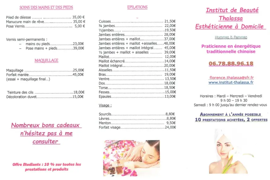 Réservez directement vos soins du corps ou massages auprès de Florence ( 06 78 88 96 18 ) ou